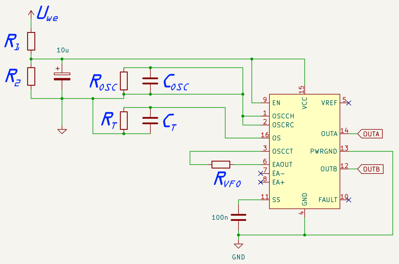 MC34067 to układ scalony sterownika PWM dla quasi-rezonansowych przetwornic ZVS. Umożliwia on generację sygnału sterującego dla elementu kluczującego w bardzo szerokim zakresie częstotliwości. Posiada on dwa wyjścia, na których pojawiają się sygnały w przeciwfazie, co umożliwia sterowanie także przetwornic półmostkowych i mostkowych. Aby układ właściwie współpracował z przetwornicą, należy włączyć go zgodnie z poniższym schematem, gdzie napięcie Uwe odczepia się bezpośrednio z wyjścia mostka prostowniczego. Zakres częstotliwości sygnału PWM zależy od wartości elementów COSC, ROSC i RVFO. Częstotliwość rezonansowa obwodu LLC powinna zawierać się w wyznaczonym paśmie. Współczynnik wypełnienia natomiast dyktuje pojemność CT i rezystancja RT. Z uwagi na maksymalną wartość napięcia zasilania UCCmax = 20 V, napięcie z mostka (z europejskiej sieci elektroenergetycznej 325 V) należy podzielić z użyciem dzielnika napięcia, tworzonego przez rezystory R1 i R2, o dostatecznie wysokiej mocy znamionowej.